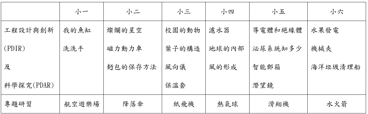 以下為部分校本工程設計與創新(PDIR)科學探究(PDAR)的主題例子: